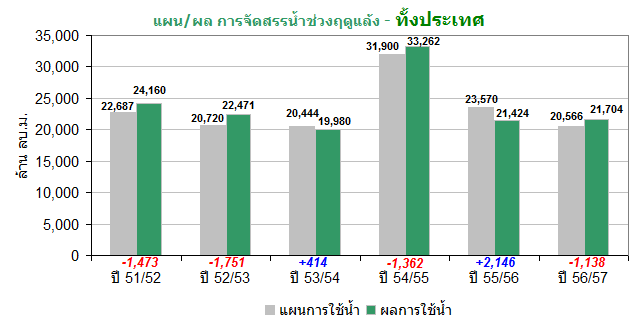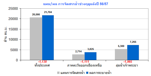 ผลการจัดสรรน้ำฤดูแล้งปี 2556/2557 เฉพาะในพื้นที่ลุ่มน้ำเจ้าพระยา ล่าสุด(31 ม.ค. 57) มีการใช้น้ำไปแล้ว 3,265 ล้านลูกบาศก์เมตร คิดเป็นร้อยละ 62 ของแผนฯ คงเหลือปริมาณน้ำที่จะใช้ได้ตามแผนฯ อีกประมาณ 2,000 ล้านลูกบาศก์เมตร หรือคิดเป็นร้อยละ 38 ของแผนฯ