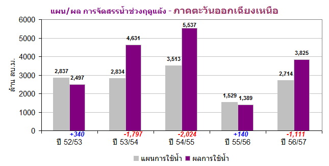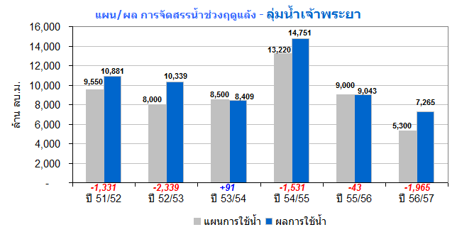 ผลการจัดสรรน้ำฤดูแล้งปี 2556/2557 เฉพาะในพื้นที่ลุ่มน้ำเจ้าพระยา ล่าสุด(5 ก.พ. 57) มีการใช้น้ำไปแล้ว 3,533 ล้านลูกบาศก์เมตร คิดเป็นร้อยละ 67 ของแผนฯ คงเหลือปริมาณน้ำที่จะใช้ได้ตามแผนฯ อีกประมาณ 1,700 ล้านลูกบาศก์เมตร หรือคิดเป็นร้อยละ 33 ของแผนฯ
