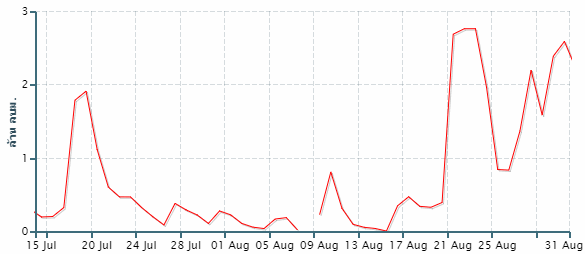 เดือนสิงหาคม มีฝนตกกระจายในทุกภาคของประเทศ ปริมาณฝนเพิ่มขึ้นจากเดือนกรกฎาคมเล็กน้อย ส่งผลให้มีปริมาณน้ำไหลเข้าอ่างเก็บน้ำขนาดใหญ่เพิ่มมากขึ้น แต่เป็นการเพิ่มขึ้นเพียงเล็กน้อยเท่านั้น เนื่องจากกลุ่มฝนตกหนักส่วนใหญ่ยังคงกระจุกตัวอยู่บริเวณนอกพื้นที่รับน้ำของอ่างเก็บน้ำขนาดใหญ่ ส่งผลให้สถานการณ์น้ำในอ่างเก็บน้ำขนาดใหญ่ในหลาย ๆ อ่าง ยังคงอยู่ในสภาวะน้ำน้อย เสี่ยงต่อการขาดแคลนน้ำ โดยเฉพาะอ่างเก็บน้ำที่อยู่ในพื้นที่ภาคเหนือและภาคกลาง