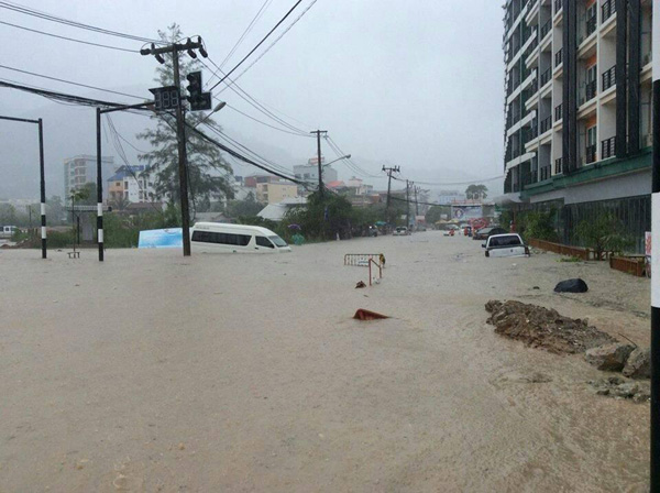 จังหวัดภูเก็ต วันที่ 15 ส.ค.57 ได้เกิดฝนตกหนักต่อเนื่องช่วงเวลา 02.00-06.00 น. ทำให้เกิดน้ำท่วมขังเนื่องจากระบายไม่ทัน และดินสไลด์ทำให้กำแพงถล่มทับรถยนต์และจักรยานยนต์ในพื้นที่เทศบาลเมืองป่าตอง อำเภอกะทู้ ทำให้เกิดความเสียหาย ดังนี้