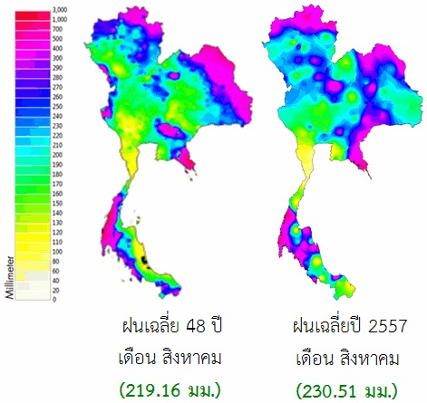ช่วงเดือนสิงหาคม 2557 มรสุมตะวันตกเฉียงใต้พัดปกคลุมทะเลอันดามัน ประเทศไทย และอ่าวไทยเกือบตลอดทั้งเดือน นอกจากนี้ในช่วงต้นเดือนและช่วงกลางเดือน เกิดร่องมรสุมพาดผ่านเหนือประเทศไทยบริเวณประเทศพม่า ลาว และเวียดนามตอนบน ต่อมาในช่วงปลายเดือนร่องมรสุมดังกล่าวได้เลื่อนลงมาพาดผ่านประเทศไทยตอนบนบริเวณภาคเหนือ ภาคกลาง และภาคตะวันออกเฉียงเหนือเข้าสู่หย่อมความกดอากาศต่ำบริเวณอ่าวตังเกี๋ย ประกอบกับมีหย่อมความกดอากาศต่ำปกคลุมบริเวณภาคเหนือในบางช่วง ทำให้เดือนนี้บริเวณประเทศไทยตอนบนมีฝนตกระจายเป็นระยะๆ โดยเฉพาะในช่วงปลายเดือนที่พื้นที่ส่วนใหญ่มีปริมาณและการกระจายของฝนเพิ่มขึ้น สำหรับภาคใต้มีฝนตกหนาแน่นเป็นช่วงๆ กับมีฝนตกหนักถึงหนักมากบางพื้นที่ส่วนมากทางฝั่งตะวันตกของภาค โดยเดือนนี้มีปริมาณฝนเฉลี่ยทั้งประเทศสูงกว่าค่าปกติประมาณ 5% และสูงกว่าค่าปกติในเกือบทุกภาค ยกเว้นภาคตะวันออกเฉียงเหนือและภาคตะวันออกที่มีฝนต่ำกว่าค่าปกติ