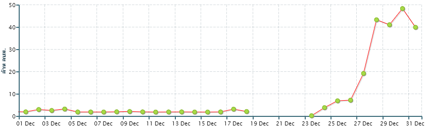 ช่วงครึ่งหลังของเดือนธันวาคม บริเวณความกดอากาศสูงกำลังค่อนข้างแรงจากประเทศจีนแผ่ลงมาปกคลุมบริเวณประเทศไทยตอนบน ส่งผลให้ตอนบนของประเทศอุณหภูมิลดลง โดยเฉพาะบริเวณภาคเหนือและภาคตะวันออกเฉียงเหนือมีอากาศหนาว สาหรับบริเวณเทือกเขาและยอดดอยมีอากาศหนาวถึงหนาวจัด ส่วนภาคใต้อิทธิพลจากมรสุมตะวันออกเฉียงเหนือที่พัดปกคลุมอ่าวไทยและภาคใต้มีกำลังแรงต่อเนื่อง ทำให้ภาคใต้มีฝนเพิ่มขึ้น โดยเฉพาะด้านตะวันออกของภาคตั้งแต่จังหวัดสุราษฎร์ธานีลงไป
