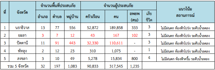 จังหวัดที่ยังคงมีสถานการณ์อุทกภัย มีทั้งสิ้น 5 จังหวัด ประกอบด้วย จังหวัดนราธิวาส ยะลา ปัตตานี พัทลุง และสงขลา รวม 32 อำเภอ 197 ตำบล