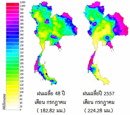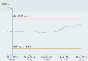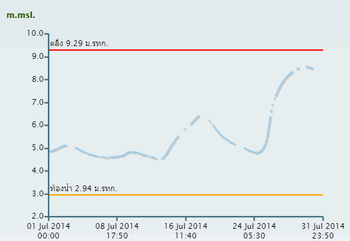 จากการตรวจวัดระดับน้ำโดยสถานีโทรมาตรตรวจวัดระดับน้ำของสถาบันสารสนเทศทรัพยากรน้ำและการเกษตร (องค์การมหาชน) พบว่า จากเหตุการณ์ฝนตกหนักช่วงเดือนกรกฎาคม ทำให้เกิดน้ำล้นตลิ่งในหลายจุด รวมทั้งในบางจุดมีระดับน้ำเพิ่มสูงขึ้นค่อนข้างมาก โดยตรวจพบระดับน้ำล้นตลิ่งบริเวณลุ่มน้ำโขง(เหนือ) ที่สถานี CHR005 - ต.เวียง จ.เชียงแสน จ.เชียงราย ลุ่มน้ำโขง(อีสาน) สถานี KON005 - ต.นาคำ อ.บ้างดุง จ.อุดรธานี ลุ่มน้ำมูลที่สถานี MUN016 - ต.เชียงเพ็ง อ.ป่าติ้ว จ.ยโสธร และลุ่มน้ำชี ที่สถานี CHI014 - ต.เดิด อ.เมือง จ.ยโสธร รายละเอียดแสดงดังกราฟด้านล่าง